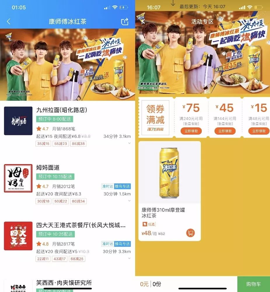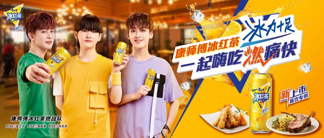 康师傅冰红茶充分发挥代言人R1SE周震南、何洛洛、夏之光3人的号召力,联合饿了么、大众点评和美团发起“一起嗨吃燃痛快”的线上主题活动,引导年轻群体尝试新品;另一方面,代言人的加入造势也给予线下餐饮商家进货的信心,为新品打开了大量的线下体验资源。C端,代言人站台在年轻群体中形成推力,推动了新品的试饮和口碑;B端,代言人的造势在餐饮商家中形成拉力,拉进了商家与品牌的距离。两股力量形成合力,彻底打通中高端餐饮渠道营销链路,最大化打造餐饮场景,让年轻群体在线上餐饮平台和线下餐饮实体店都能享受到“一起嗨吃燃痛快”的快乐。